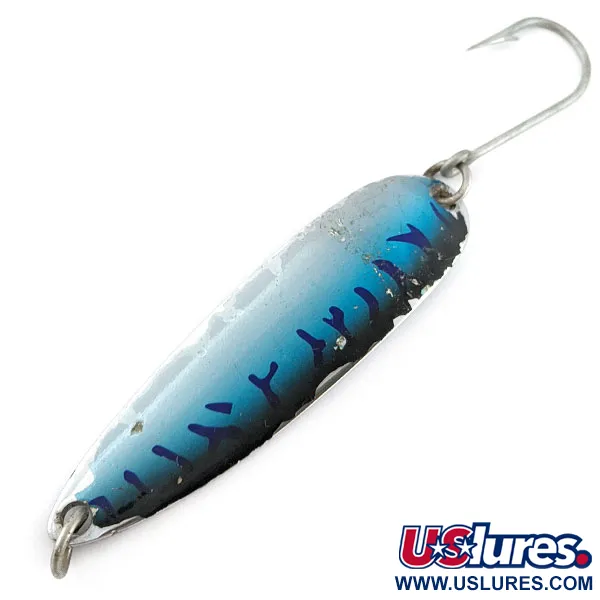 Tiefblaue Makrelenschuppen zieren die Oberseite dieses Luhr Jensen Krocodile #5 und gehen zu den Rändern hin in ein helleres Perlmutt-Finish über. Mit einer Länge von 8,5 cm und einem Gewicht von 28 g ist dieser Blinker speziell für maximale Wurfweiten konzipiert. Auf der polierten Chrom-Rückseite sind die authentischen Prägungen „KROCODILE“ und „LUHR JENSEN“ eingestempelt. Das Modell mit dem Produktcode 20377 ist mit einem robusten Einzelhaken ausgestattet und damit eine verlässliche Wahl für das Angeln auf Lachse oder Meeresräuber, bei denen ein sicherer Anhieb entscheidend ist. Dieses Exemplar befindet sich in einem Zustand von 4/5; es zeigt leichte Gebrauchsspuren, während die Leuchtkraft des Makrelendekors und die hohe Reflexionskraft der Metallbeschichtung voll erhalten geblieben sind. Der schmale, massiv geprägte Körper schneidet beim Auswerfen von Molen oder Stegen effizient durch Seitenwind.
