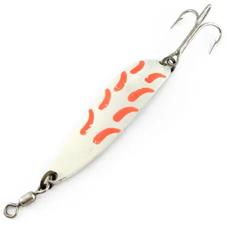 Mit einem Gewicht von 28 g (1 oz) zählt dieser massive Metallblinker zu den vielseitigsten Modellen, die jemals für das Spinn- und Schleppfischen entwickelt wurden. Der 8,5 cm (3 1/4") lange Körper dieses Luhr Jensen Krocodile #5 besticht durch ein markantes weiß-oranges UV-Muster auf der Vorderseite, das die Sichtbarkeit in tieferen oder trüben Gewässern deutlich erhöht. Dieses in den USA gefertigte Exemplar mit dem Produktcode 21107 ist mit der Original-Hardware ausgestattet, wozu ein robuster Drillingshaken und ein Tönnchenwirbel gegen Schnurdrall gehören. Die Rückseite verfügt über ein hochglanzpoliertes Chrom-Finish, das im Kontrast zur lackierten Vorderseite für starke Lichtreflexe sorgt. Mit einer Bewertung von 5/5 präsentieren sich Lackierung und Komponenten in einem hervorragenden Zustand. Seine schmale, zulaufende Form ist typisch für die Krocodile-Serie und erlaubt sowohl Präsentationen im Tiefwasser als auch enorme Wurfweiten.