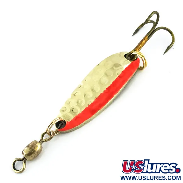 Eine gehammerte Goldstruktur verleiht diesem 3,5 cm (1 1/2") langen Blinker eine facettenreiche Oberfläche, die das Licht unter Wasser effektiv einfängt. Dieser spezielle Luhr Jensen Krocodile mit der Artikelnummer 8961 wiegt 7 g (1/4 oz) und ist somit eine vielseitige Wahl für verschiedene Anwendungen im Süßwasser und leichten Salzwasser. Die Vorderseite zeichnet sich durch ihr gehämmertes Metallfinish aus, das durch einen kräftigen, länglichen orangefarbenen Streifen akzentuiert wird, während die Rückseite eine glatte Goldoberfläche aufweist, in die der Hersteller- und Modellname eingestempelt ist. Der Krocodile ist unter erfahrenen Anglern für seine charakteristische taumelnde Aktion bekannt. Seine schmale Tropfenform ist für weite Würfe und gleichmäßiges Einholen ausgelegt. Dieses Exemplar befindet sich in einem ausgezeichneten Zustand (Bewertung 5/5) und weist keine Abnutzungserscheinungen am lackierten Streifen oder der Metallbeschichtung auf. Die Hardware ist robust und umfasst einen Tönnenwirbel aus Messing am Kopf sowie einen scharfen Drillingshaken, der über einen stabilen Sprengring befestigt ist. Er ist ein erstklassiges Beispiel für die Handwerkskunst, die Luhr Jensen über Jahrzehnte hinweg zu einem festen Bestandteil jeder Tacklebox gemacht hat.