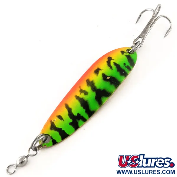 Klar in die messingfarbene Unterseite eingestempelt ist die Herkunft Hood River, Oregon – ein Markenzeichen dieser klassischen Luhr Jensen Blinker. Dieser Krocodile Die #3 mit dem Produktcode 11367 wiegt 1/3 oz (10 g) und ist 2 1/4" (5,5 cm) lang. Die Oberseite ist im lebhaften Fire Tiger Muster gehalten, mit einem leuchtend orangefarbenen Rücken, der über Gelb in Chartreuse-Grün übergeht, überlagert von dicken schwarzen vertikalen Streifen. Mit einer Zustandsbewertung von 5/5 sind die Metalloberflächen und die Original-Hardware bemerkenswert sauber und glänzend. Dieses dickere und schmalere Design wurde speziell für große Wurfweiten entwickelt und erzeugt beim gleichmäßigen Einholen eine ausgeprägte Taumelbewegung, die einen lebenden Köderfisch imitiert. Ein robuster Tonnwirbel ist am vorderen Sprengring befestigt, um Schnurdrall zu reduzieren, während das Heck einen starken Drillingshaken trägt.
