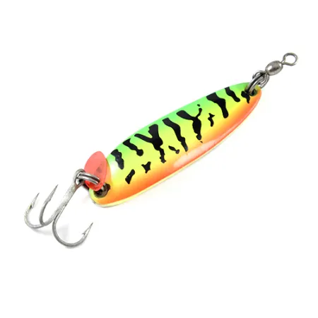 Tief in die Messingrückseite eingestempelt, bestätigen der Name „KROCODILE“ und die Markierung „DIE #3“, dass dieser Luhr Jensen Blinker ein echter amerikanischer Klassiker ist. Mit einem Gewicht von 1/2 oz (14 g) und einer Länge von 2 1/4" (5,5 cm) ist dieses Modell perfekt beschwert, um tiefere Standplätze zu erreichen, an denen Raubfische lauern. Die Vorderseite zeigt das klassische Firetiger-Dekor mit markanten schwarzen Vertikalstreifen, die über Neongrün und Gelb in ein leuchtendes Orange am Schwanzende übergehen. Das Finish ist mit 5/5 bewertet, außergewöhnlich sauber und bewahrt den ursprünglichen Glanz des polierten Messings auf der Rückseite. Er ist mit einem robusten Sprengring und einem scharfen Drillingshaken ausgestattet, ergänzt durch das markante rote Lockplättchen aus Kunststoff, das einen deutlichen optischen Bisspunkt direkt am Haken setzt. Am oberen Ende ist ein Tönnchenwirbel montiert, um Schnurdrall beim Werfen oder Schleppen zu minimieren. Dieses spezifische Modell mit dem Produktcode 2736 spiegelt die hohen Fertigungsstandards wider, die Luhr Jensen für seine Profi-Blinker beibehält.