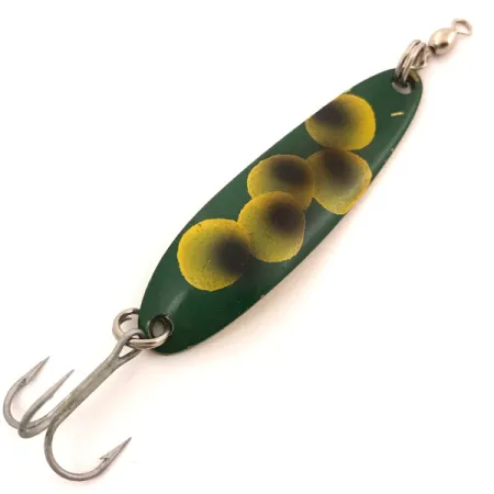 Dieser 1/3 oz (10 g) Blinker im markanten Frog-Dekor besticht durch kräftige gelbe Punkte mit dunkler Mitte auf tiefem waldgrünem Hintergrund. Mit einer Länge von 2 1/4" (5,5 cm) weist dieses Modell das klassische Luhr-Jensen-Profil auf, wobei es schmaler und dicker als herkömmliche Blinker gefertigt ist, um beim Wurf größere Distanzen zu erzielen. Auf der Rückseite des messingfarbenen Metalls sind die Prägungen „KROCODILE“, „DIE #3“ und „HOOD RIVER, ORE“ deutlich zu erkennen, was seine amerikanische Herkunft unterstreicht. Dieses Exemplar mit dem Produktcode 3866 weist leichte, ehrliche Gebrauchsspuren auf der Metallrückseite auf, während die lackierte Vorderseite bemerkenswert sauber und farbenfroh geblieben ist, was ihm eine Zustandsbewertung von 4/5 einbringt. Die Montage umfasst einen stabilen Drilling, der über einen Sprengring befestigt ist, sowie einen oberen Wirbel, um Schnurdrall zu vermeiden. Konzipiert für Arten vom Lachs in den Großen Seen bis zur Seeforelle, ist der Krocodile weithin bekannt für sein konstantes Taumeln, das bei gleichmäßigem Einholen einen Beutefisch effektiv imitiert.