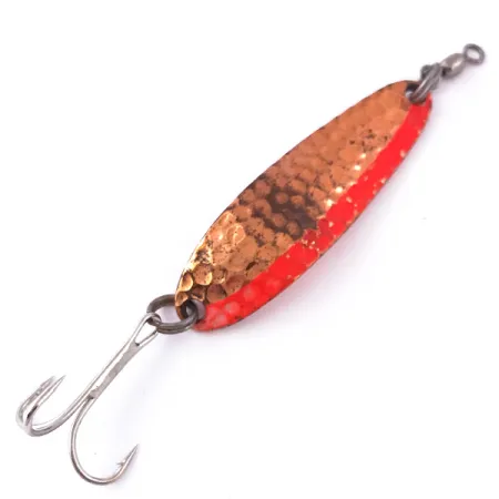 Ein gehämmertes Kupferfinish fängt das Licht auf der Oberfläche dieses Luhr Jensen Klassikers ein und sorgt für eine Textur, die die natürlichen Schuppen von Beutefischen nachahmt. Dieser spezielle Krocodile Die #3, identifiziert durch den Produktcode 3966, verfügt über einen markanten roten Streifen, der auf UV-Licht reagiert – ein fluoreszierendes Detail, das in tieferem Wasser oder bei schlechten Lichtverhältnissen sichtbar bleibt. Mit einem Gewicht von 1/3 oz (10 g) und einer Länge von 2 1/4" (5,5 cm) ist sein schmales und dickes Profil charakteristisch für das Design der Serie für weite Würfe. Die Vorderseite weist eine tief gedellte Textur auf, während die Rückseite ein glattes, poliertes Kupferfinish zeigt, das zusätzlichen Flash bietet. Die Hardware umfasst einen werkseitig installierten Tönnenwirbel und einen Drillingshaken, die beide die Haltbarkeit widerspiegeln, die Angler von dieser Marke erwarten. Mit einem Zustand von 4/5 ist dieser Blinker gut erhalten und weist nur leichte Alterserscheinungen auf. Seine spezifische Gewichtsverteilung erzeugt ein gleichmäßiges Taumeln beim Einholen, was ihn zu einem zuverlässigen Werkzeug für den Fang von Lachsen oder Forellen unter verschiedenen Bedingungen macht.