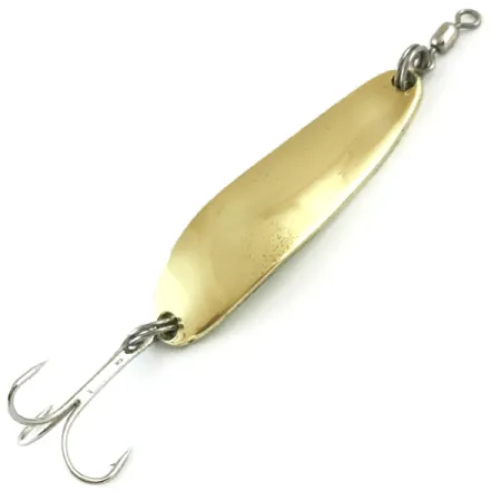 Der Name Luhr Jensen und Krocodile ist deutlich in das Metall auf der Rückseite dieses 1/2 oz (14 g) Blinkers eingestempelt. Dieses Modell Die #3, katalogisiert unter dem Code 5781, zeichnet sich durch sein schmales Tropfenprofil mit einer Länge von 5,5 cm (2 1/4") aus. Das polierte Gold-Finish ist über den gesamten Körper hinweg außergewöhnlich sauber und spiegelt die Fertigungsqualität wider, die mit der Tradition von Luhr Jensen im pazifischen Nordwesten verbunden ist. Für die Montage ist er am oberen Sprengring mit einem Tönnchenwirbel und am Ende mit einem silberfarbenen Drilling ausgestattet. Dieses besondere Exemplar befindet sich in einem 5/5-Zustand und weist eine hochglänzende Oberfläche auf, die hell und reflektierend bleibt. Die hohe Materialstärke des Metalls wurde vom Hersteller bewusst gewählt, um Anglern zu helfen, bei einem gleichmäßigen Einholen tiefere Wasserschichten zu erreichen. Jedes Detail, von der sauberen Beschriftung der Markenprägung bis hin zur Integrität der Kleinteile, deutet auf ein bestens erhaltenes Stück Angelgeschichte hin.