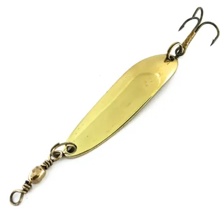 Auf der konkaven Seite des Metalls sind die Worte KROCODILE und HOOD RIVER, ORE tief eingeprägt, was das Erbe von Luhr Jensen für diesen klassischen Blinker unterstreicht. Mit einem Gewicht von 1/3 oz (10 g) und einer Länge von 2 1/4" (5,5 cm) trägt dieser Krocodile Die #3 den spezifischen Produktcode 8652. Der Köder verfügt über einen Korpus aus schwerem Messing in brillanter Goldfarbe, der außergewöhnlich sauber bleibt, was eine Zustandsbewertung von 5/5 rechtfertigt. Er ist mit robuster Hardware ausgestattet, darunter ein hochwertiger Tönnchenwirbel am vorderen Sprengring und ein stabiler Drilling am Heck. Die spezifische Dicke des Messings ermöglicht beachtliche Wurfweiten und hilft dem Blinker, während des Einholens die Tiefe zu halten. Die Beschriftung auf der Rückseite ist scharf und gut lesbar und hebt sich von der polierten Goldoberfläche ab, die das Licht mit hoher Sichtbarkeit reflektiert. Die Oberflächen des Köders sind glatt und die Hardware weist keine Abnutzungserscheinungen auf, wodurch die Integrität des originalen vergoldeten Messings erhalten bleibt.