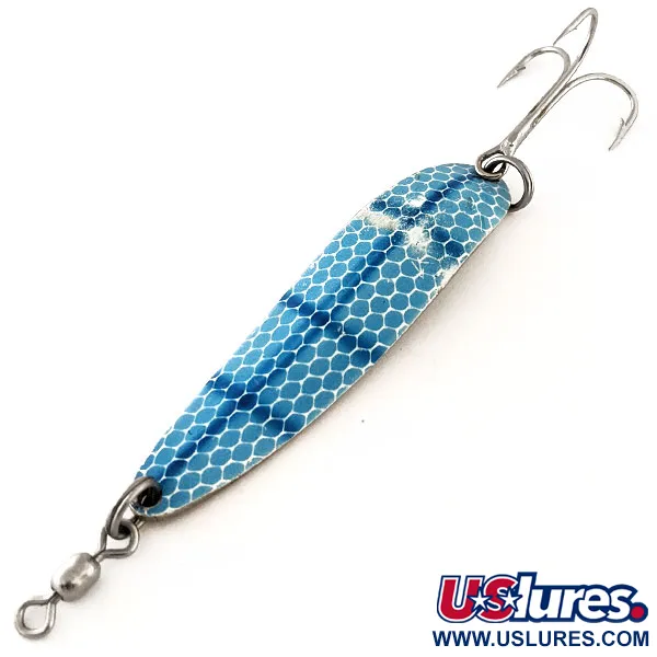 Ein hexagonales Wabenmuster in einem kräftigen blauen Fischschuppen-Finish ziert die Vorderseite dieses 14g (1/2oz) schweren Blinkers. Mit einer Länge von 6,5cm (2 1/2") trägt das Modell Die #4 die klassische Prägung "LUHR JENSEN KROCODILE" auf der polierten Nickelrückseite. Dieses in den USA hergestellte Exemplar, gelistet unter dem Produktcode 11585, verfügt über ein dickeres und schmaleres Profil, das weite Würfe ermöglicht, um tief stehende Fische zu erreichen. Der Köder ist mit einem oberen Wirbel und einem stabilen Drilling ausgestattet. Das Finish ist hell und klar, in einem gut erhaltenen Zustand von 4/5 mit minimalen Gebrauchsspuren. Beim Einholen erzeugt die spezifische Gewichtsverteilung des Blinkers eine gleichmäßige taumelnde Bewegung, die das Schwimmverhalten eines lebenden Köderfisches imitiert.