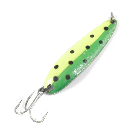 Mit einem Gewicht von 1/2 oz (14 g) verfügt dieser klassische Luhr Jensen Blinker über eine lebendige zweifarbige Lackierung auf der konvexen Seite. Eine Hälfte der Oberfläche ist leuchtend gelb, während die andere Hälfte in ein tiefes Grün übergeht, beide verziert mit einer Reihe deutlicher schwarzer Punkte. Mit einer Länge von 2 1/2" (6,5 cm) ist der Krocodile Die #4 ein vielseitiges Werkzeug für Angler, die tiefere Wasserschichten erreichen müssen, in denen Raubfische wie Lachse oder Seeforellen jagen. Die Rückseite des Köders zeigt ein poliertes Nickelfinish, das mit den Herstellerdetails und der spezifischen Bezeichnung Die #4 gestempelt ist, ein Beweis für seine amerikanische Herkunft. Dieses besondere Exemplar mit dem Produktcode 1983 weist eine Zustandsbewertung von 4/5 auf und präsentiert sich sauber mit minimalen Gebrauchsspuren. Die Konstruktion aus dickem Metall ist mit einem zuverlässigen Drilling und stabilen Sprengringen kombiniert.