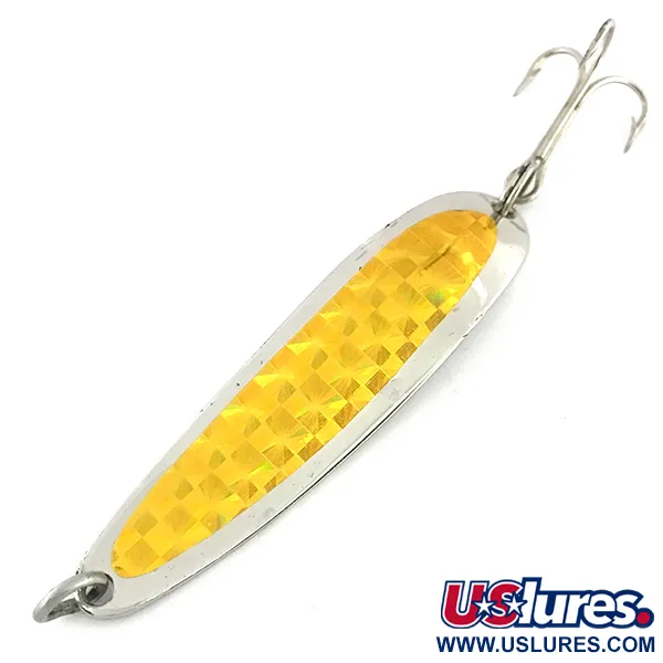 Der Krocodile Die #4 ist 6,5 cm (2 1/2 Zoll) lang und verfügt über ein markantes goldenes Prismaband auf einer polierten Nickeloberfläche. Dieser 14 g (1/2 oz) schwere Blinker von Luhr Jensen mit der Artikelnummer 8533 spiegelt die klassische Handwerkskunst aus Hood River, Oregon, wider. Der schmale, dickwandige Körper ist ein Markenzeichen des Krocodile-Designs und ermöglicht hohe Wurfweiten oder das Halten der Tiefe beim Schleppfischen. Auf der Rückseite ist das Metall deutlich mit dem Namen des Herstellers und dem Standort gestempelt, was die sauberen Linien der Nickelbasis unterstreicht. Die Montage besteht aus einem stabilen Sprengring und einem scharfen Drilling, was die originale Werksqualität zeigt. Mit einer Bewertung von 5/5 ist dieses Exemplar in hervorragendem Zustand und behält seine hohe Reflexionskraft sowie die scharfe Geometrie des holografischen Musters bei. Die Kombination aus silbern glänzender Rückseite und goldener Vorderseite bietet Raubfischanglern ein vielseitiges Farbspektrum.