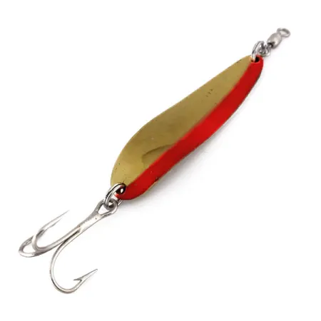 Mit einem Gewicht von 21 g ist dieser Luhr Jensen Krocodile Die #4 UV für weite Würfe und das Erreichen tieferer Wasserschichten konzipiert. Der Blinker ist 6,5 cm lang und verfügt über ein markantes zweifarbiges Finish mit einer polierten Goldseite und einer Rückseite in kräftigem Orange. Unter schlechten Lichtverhältnissen oder UV-Licht zeigt das orangefarbene Segment ein auffälliges Leuchten, was ihn zu einer strategischen Wahl für trübes Wasser oder tief stehende Lachse und Forellen macht. Die Konstruktion besteht aus einem dicken, schmalen Metallkörper, der schnell sinkt und den Wind mühelos schneidet. Zur Ausstattung gehören ein robuster Drillingshaken, der über einen Sprengring befestigt ist, sowie ein integrierter Wirbel an der Oberseite, um Schnurdrall zu vermeiden. Dieses Exemplar befindet sich in einem Zustand von 5/5, wobei Finish und Haken besonders gut erhalten sind. Die Sprengringe sind fest und halten die Komponenten beim Auswerfen oder Schleppfischen sicher zusammen.