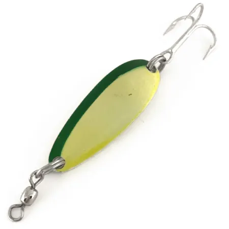 Dieser mit einem auffälligen, extrem sichtbaren UV-Finish beschichtete Blinker verfügt über einen markanten grünen Streifen an einer Kante seines phosphoreszierenden Körpers. Mit einem Gewicht von 1/3 oz (9 g) und einer Länge von 1 1/2" (4 cm) ist der Luhr Jensen Krocodile UV (Produktcode 7542) auf maximale Wurfdistanz ausgelegt. Die lumineszierenden Eigenschaften sind in lichtarmen Umgebungen besonders gut sichtbar, wobei die cremeweiße Oberfläche ein hellgrünes Leuchten abgibt, das Raubfischen hilft, den Köder in tiefem Wasser aufzuspüren. Dieses Modell ist mit einem silbernen Drilling und einem integrierten Tönnchenwirbel ausgestattet, um Schnurverdrallung beim Auswerfen oder Schleppangeln zu verhindern. Hergestellt in den USA, ermöglicht seine schmale, schwere Bauweise ein effizientes Durchschneiden der Luft, um die Schlagzone präzise zu erreichen. Lackierung und Hardware sind in hervorragendem Zustand und spiegeln eine 5/5-Bewertung wider. Der Stempel auf der Rückseite kennzeichnet ihn als echtes Luhr Jensen Gerät.