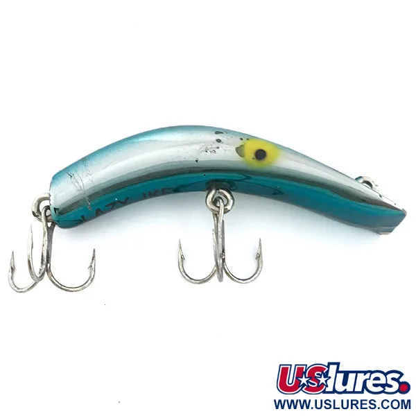Dieses 14 g (1/2 oz) schwere Exemplar im markanten Hellblau Metallic über Spiegelsilber besticht durch sein klassisches bananenförmiges Profil, das in den USA zum festen Bestandteil jeder Köderbox wurde. Mit einer Länge von 8,5 cm (3 1/4") trägt der Köder den eingestanzten Namen „LAZY IKE“ deutlich auf dem Bauch – ein Merkmal, auf das Sammler als Zeichen für echte Handwerkskunst achten. Dieses Modell mit der Artikelnummer 6739 ist ein schwimmender Wobbler, der für den Einsatz im Flachwasser zwischen 0,3 und 0,6 m (1-2 ft) konzipiert wurde. Das Finish ist mit einer Zustandsbewertung von 5/5 hervorragend erhalten, wobei der spiegelsilberne Bauch für reichlich Reflexion sorgt. Er ist mit zwei scharfen Drillingshaken an robusten Sprengringen ausgestattet. Die gelb lackierten Augen mit den markanten schwarzen Pupillen sitzen weit vorne und verleihen dem metallischen Körper Charakter. Entwickelt für das Spinnfischen und Schleppangeln auf Zander oder Hecht, spiegelt dieser Köder die Robustheit klassischer amerikanischer Angelgeräte aus der Mitte des Jahrhunderts wider. Der Rücken geht in ein helles Blau über, das sich sauber von den silbernen Flanken absetzt.