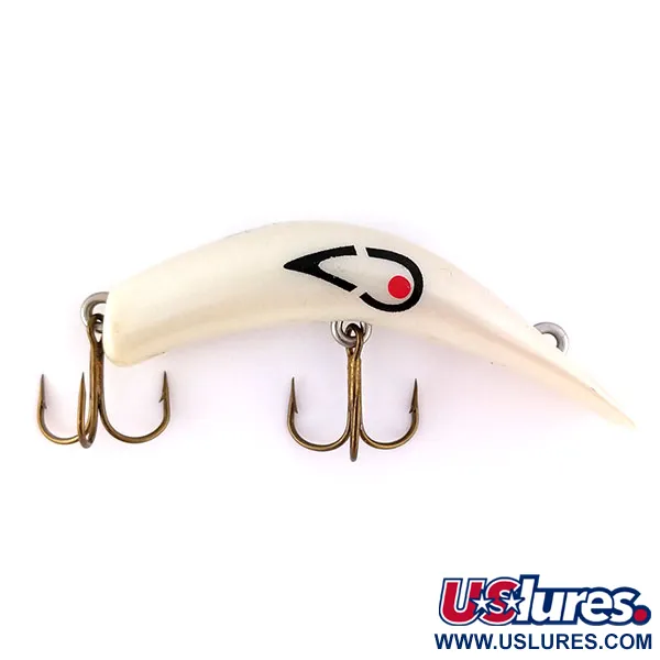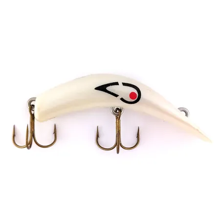 Mit einer Länge von 6 cm (2 1/4") besticht dieser in den USA hergestellte Vintage-Wobbler durch sein markantes, gebogenes Profil in elegantem Weißperlmutt. Dieses Exemplar mit dem Produktcode 9990 trägt die charakteristische schwarz-rote Augen-Grafik auf der Flanke. Mit einem Gewicht von 6 g (3/16 oz) ist der bananenförmige Körper speziell für Flachwasserbereiche zwischen 0,3 m und 0,6 m (1 ft bis 2 ft) konzipiert. Zwei Bronze-Drillinge befinden sich in erstklassigem Zustand und entsprechen der Gesamtbewertung von 5/5 der äußeren Erscheinung. Die Einhängeöse ist in den oberen Teil der abgeschrägten Front eingelassen – ein typisches Merkmal für Wurf- und Schlepptechniken auf Hecht und Zander. Der perlmuttartige Glanz des Kunststoffkörpers ist vollständig erhalten geblieben.