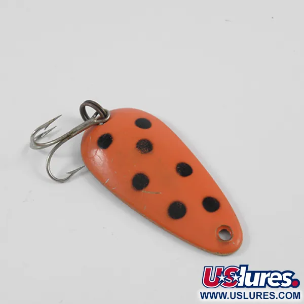 Verziert mit einem markanten Muster aus sechs schwarzen Punkten auf einem leuchtenden orangeroten Finish, trägt dieser in Kanada gefertigte Blinker das Erbe eines Designs in sich, das seit 1929 ein fester Bestandteil jeder Tackle-Box ist. Mit einem Gewicht von 1/2 oz (14 g) misst der tropfenförmige Messingkörper 2" (5,0 cm) in der Länge, was ihn zu einer vielseitigen Wahl sowohl für das Spinnfischen als auch für das Schleppangeln macht. Die Rückseite des Köders ist mit der klassischen, tiefgeprägten Herstellersignatur versehen, die ihn als Modell Len Thompson #00 ausweist. Die Lackierung ist bemerkenswert sauber, und mit einer Zustandsbewertung von 4/5 weist das Exemplar nur leichte Handhabungsspuren auf, während die glänzende, reflektierende Messingoberfläche auf der Rückseite erhalten bleibt. Er ist mit einem stabilen Sprengring und einem originalen Drillingshaken ausgestattet, um die langsame, taumelnde Aktion zu unterstützen, die diesen spezifischen Beutefisch-Imitator auszeichnet. Sammler werden die spezifische Hardware und Prägung unter dem Produktcode 2579 wiedererkennen.