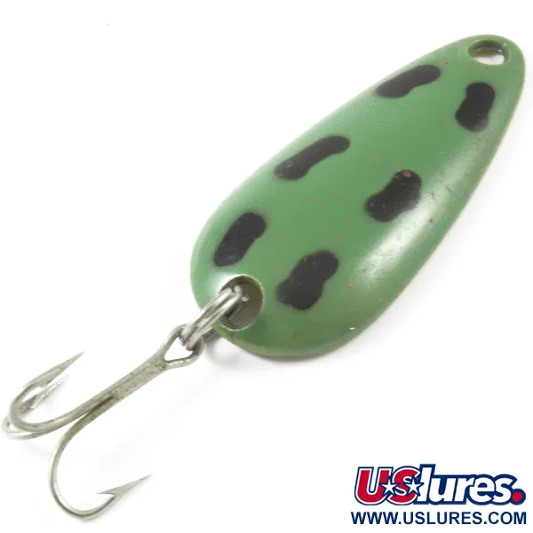 Auf der Unterseite aus Messing ist deutlich die Markierung „LEN THOMPSON No. 00“ eingestempelt, die diesen kanadischen Klassiker kennzeichnet. Die Oberseite weist eine mattgrüne Grundfarbe mit sieben schwarzen Punkten auf – ein Muster, das häufig Amphibien oder Beutefische imitiert. Mit einer Länge von 5 cm (2") und einem Gewicht von 14 g (1/2 oz) besteht der Blinker aus massivem Messing, ein Material, das der Hersteller seit 1929 verwendet, um eine spezifische Balance zu gewährleisten. Diese Gewichtsverteilung ermöglicht eine langsam taumelnde Aktion beim Einholen. Die Hardware besteht aus einem einzelnen Drilling, der mit einem Sprengring am Heck befestigt ist, während sich an der verjüngten Nase eine Öse befindet. Unter der Artikelnummer 3217 katalogisiert, befindet sich das Exemplar in einem Zustand von 4/5, mit gut erhaltenem Lack auf der Oberseite und einer hellen, sauberen Messingoberfläche auf der Rückseite. Das Auswerfen oder Schleppfischen mit diesem Löffelblinker ist eine traditionelle Methode für Hecht, Lachs und Seeforelle.
