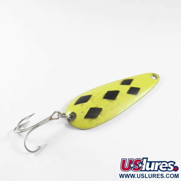 Fünf schwarze Rauten im klassischen Muster auf einer leuchtend gelben Lackierung prägen das Design dieses in Kanada hergestellten Blinkers. Mit einem Gewicht von 3/4 oz (21 g) und einer Länge von 2 3/4" (7 cm) bietet dieses Modell der Größe #1 ein markantes Profil für die Jagd auf Hecht oder Namaycush. Die Rückseite im Messing-Finish trägt den eingestanzten Namen des Herstellers Len Thompson, dessen Produktionstradition in der Region bis ins Jahr 1929 zurückreicht. Dieses Exemplar mit dem Produktcode 1748 weist leichte Gebrauchsspuren an Lack und Metall auf, befindet sich jedoch in einem 4/5-Zustand. Ein silberfarbener Drilling ist am Heck über einen stabilen Sprengring montiert, sodass der Köder sofort zum Werfen oder Schleppfischen bereit ist. Die spezifische Wölbung des Metalls wurde entwickelt, um beim Einholen eine langsame, taumelnde Aktion zu erzeugen. Die Messingbasis bleibt auf der Rückseite sichtbar und bietet einen dezenten Lichtreflex als Kontrast zur auffälligen gelben Vorderseite.