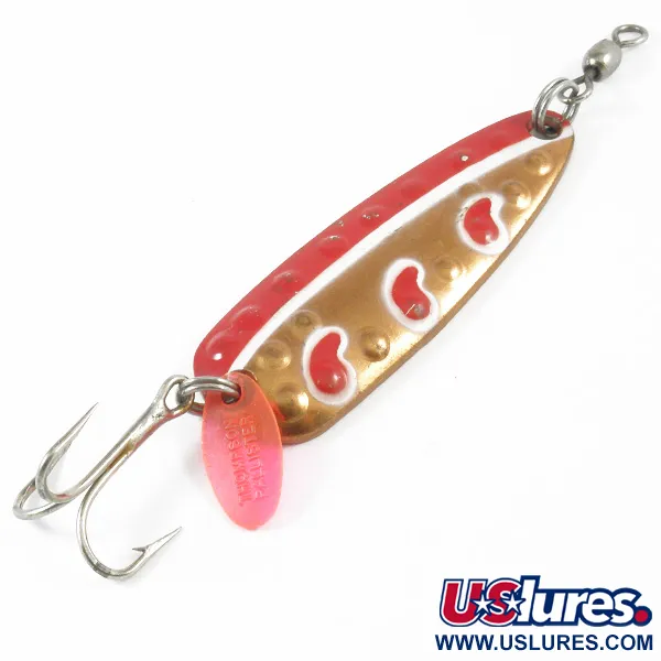 Kupferbeschichtung mit eingestanzten Dellen auf der Rückseite unterstreicht die traditionelle Handwerkskunst der kanadischen Köderherstellung. Mit einem Gewicht von 25g (1oz) und einer Länge von 7cm (2 3/4") verfügt dieser Len Thompson #13 über ein markantes rot-weißes Tropfenmuster auf einem polierten Kupferkörper. Dieses spezielle Exemplar, identifiziert durch den Produktcode 3287, befindet sich in einem 5/5-Zustand mit glänzendem Finish und gut erhaltenem Lack. Die Hardware umfasst einen stabilen Drillingshaken mit einem durchscheinenden rosa Lockblättchen und einen robusten Tönnchenwirbel am vorderen Sprengring. Auf der konkaven Innenseite ist die Herstellermarke deutlich in das Metall inmitten einer texturierten Oberfläche eingestempelt. Dieser Blinker ist vielseitig einsetzbar und wird häufig zum Spinnfischen oder Schleppen auf Hecht, Lachs und Seeforelle verwendet.