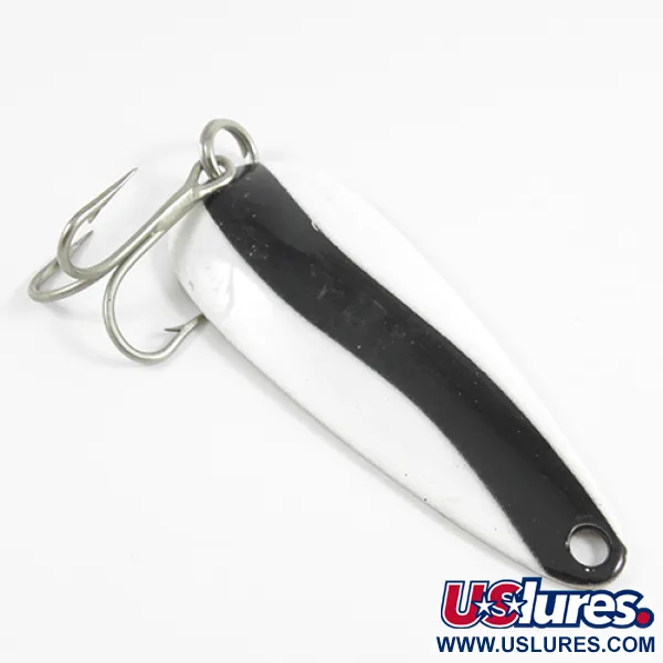 Die deutlich auf der messingfarbenen Unterseite eingeprägte Markierung „LEN THOMPSON NO 2“ weist auf die Herkunft dieses 28g schweren kanadischen Klassikers hin. Mit einer Länge von 8 cm (3 1/4") verfügt dieser Blinker über eine kontrastreiche schwarz-weiße Lackierung auf der gewölbten Vorderseite, kombiniert mit einer polierten Messingrückseite. Dieses spezielle Exemplar unter dem Produktcode 2518 befindet sich in einem 5/5-Zustand mit sauberen Oberflächen und scharfen Kanten am Metallkörper. Diese Köder werden seit 1929 hergestellt und für ihre ausgewogene Bauweise geschätzt, die ein langsames, taumelndes Spiel bei gleichmäßigem Einholen ermöglicht. Die Ausstattung ist robust, mit einem silbernen Drillingshaken und einem starken Sprengring am Heck. Ob für die Sammlung oder einen Tag am Wasser auf Hecht oder Lachs – die Handwerkskunst dieses Köders zeigt sich im glatten Finish und der präzisen Prägung.