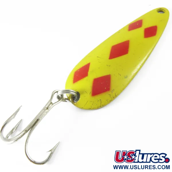 Fünf rote Rauten sind sauber auf einem leuchtend gelben Feld dieses in Kanada hergestellten Klassikers aufgemalt. Mit einem Gewicht von 28 g (1 oz) verfügt dieser spezielle Blinker (Produktcode 3681) über die traditionelle messingfarbene Rückseite, die Sammler bei frühen Len Thompson #2 Modellen suchen. Seit der Gründung der Marke im Jahr 1929 wurden diese Köder entwickelt, um das Profil eines kleinen Elritzen-Fischchens nachzuahmen, und dieses 8 cm (3 1/4") lange Exemplar trägt die markante eingestanzte Beschriftung auf der Rückseite. Ausgestattet mit einem silbernen Drilling, ist der Köder ein Standard für das Werfen oder Schleppen auf Hecht und Seesaibling. Das Farbmuster Five of Diamonds ist wohl das berühmteste im Katalog und soll für eine hohe Sichtbarkeit unter verschiedenen Wasserbedingungen sorgen. Mit einem Zustand von 4/5 bewertet, weist der gelbe Lack einige verstreute Kratzer und leichte Gebrauchsspuren auf, obwohl die strukturelle Integrität des Metalls und der Hardware ausgezeichnet bleibt. Der Blinker ist für eine langsam taumelnde Aktion konstruiert, ein technisches Merkmal, das für den Hersteller seit fast einem Jahrhundert konstant geblieben ist.