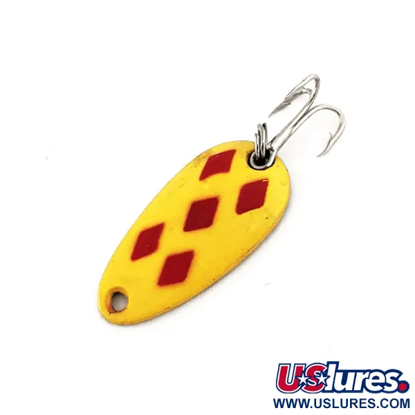 Direkt in die messingfarbene Rückseite sind die Markierungen "LEN THOMPSON NO. 6" eingestanzt, die diesen in Kanada hergestellten Wurfblinker kennzeichnen. Mit einer kompakten Länge von 2,5 cm (1") und einem Gewicht von 3,5 g (1/8 oz) trägt er das unverkennbare Five of Diamonds-Muster, das aus fünf roten Rauten auf gelber Grundierung besteht. Der Zustand des Blinkers ist außergewöhnlich, mit einem bestens erhaltenen Finish und glänzendem Metall auf der Rückseite, was eine 5/5-Bewertung rechtfertigt. Unter der Artikelnummer 11369 gelistet, verfügt dieser Blinker über einen versilberten Drillingshaken, der mit einem Sprengring befestigt ist – ideal zum Spinnfischen oder leichten Schleppfischen auf Forellen und Barschartige. Die Tropfenform und der dicke Messingkörper sind seit 1929 ein Markenzeichen von Len Thompson und sorgen für einen ausgewogenen Lauf im Wasser. Die Lackierung auf der Vorderseite ist scharf und lebendig und kontrastiert mit der polierten Messingunterseite.