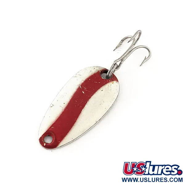 Ein markanter diagonaler roter Streifen ziert die cremeweiße Vorderseite dieses kompakten 2,5 cm (1-Zoll) Löffelköders (Spoon). Mit einem Gewicht von 3,5 g (1/8 oz) ist dieser Vintage-Fund mit dem Produktcode 11497 ein Klassiker im Len Thompson Sortiment. Die Rückseite zeigt ein Messing-Finish mit einer deutlichen Prägung als „NO. 0“, trotz der Katalogbezeichnung #6. Angler schätzen diese Spoons für ihr charakteristisches, langsames Taumeln beim Auswerfen oder Schleppen auf Forellen und Barsche. Dieses Exemplar ist im Zustand 5/5, zeigt leichte Gebrauchsspuren und feine Risse im Lack sowie etwas Nachdunkeln und Oxidation am Messing und am originalen Drillingshaken. Das Tropfenprofil ist klassisch für Len Thompson, ein Design, das seit 1929 Kleinfische imitiert.