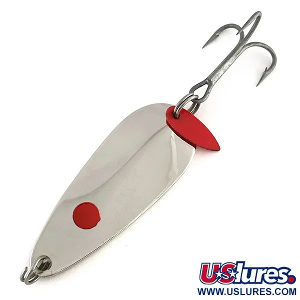 Auf der konkaven Seite des Blattes sind die Namen Les Davis und Hotrod deutlich eingestempelt, was dieses Modell 8254 als Klassiker der Angelgeschichte des pazifischen Nordwestens kennzeichnet. Das hochglänzende Nickel-Finish wird durch einen einzelnen roten Punkt auf der Vorderseite und einen charakteristischen roten Kunststoff-Flipper ergänzt, der am hinteren Sprengring neben dem Drillingshaken befestigt ist. Mit einem Gewicht von 1/2 oz (14 g) und einer Länge von 2 1/4" (5,5 cm) basiert der Köder auf einem soliden Messingkörper – ein Markenzeichen der Qualitätsfertigung im Luhr Jensen Werk in den USA. Dieses Exemplar befindet sich in einem exzellenten Zustand (5/5), mit reflektierender Oberfläche und sauberer, scharfer Hardware. Der „Hotrod“-Schriftzug ist klar und leserlich, ohne Abnutzungsspuren, wie sie oft bei Vintage-Schleppblinkern zu finden sind.