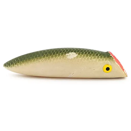 Grüne Schuppenmuster umhüllen die obere Hälfte dieses klassischen Les Davis Witch Doctor und gehen in einen sauberen, cremefarbenen Bauch über, der seinen Vintage-Charakter unterstreicht. Mit einem Gewicht von 17g (3/5oz) und einer Länge von 11,5cm (4 1/2") ist dieser in den USA gefertigte Oberflächenköder ein fester Bestandteil für Sammler der Angelgeschichte des pazifischen Nordwestens. Die markante, rot lackierte flache Front ist darauf ausgelegt, Wasser zu verdrängen, während die kräftigen gelben Augen mit schwarzen Pupillen einen kontrastreichen Zielpunkt bieten. Auf der Unterseite ist der „WITCH DOCTOR“-Schriftzug scharf und gut lesbar geblieben, ein Beleg für die Fertigungsqualität von Les Davis. Mit einer Zustandsbewertung von 4/5 weist das Exemplar leichte Oberflächenabnutzungen auf, darunter eine sichtbare Abplatzung an den grünen Schuppen und leichte Kratzer am Schwanz, wobei die strukturelle Integrität des Körpers jedoch hervorragend ist. Dieses spezielle Modell unter der Artikelnummer 22704 zeigt die einfachen, aber effektiven Farbschemata, die den US-Köderbau der Mitte des Jahrhunderts prägten.