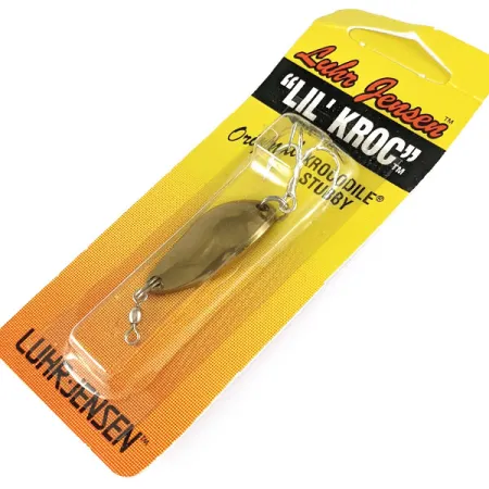 Dieser hochglanzpolierte Blinker in Gold wiegt 3/16 oz (4,5 g) und hat eine Länge von 1 1/4 Zoll (3,2 cm). Der von Luhr Jensen hergestellte Lil' Kroc (Krocodile Stubby) zeichnet sich durch ein kürzeres, kompakteres Profil im Vergleich zu den Standard-Krocodile-Modellen aus, was ihn ideal für spezielle Wurfanforderungen macht. Dieses Exemplar mit der Artikelnummer 1123-018-0002 (interne Ref. 17153) wird in der originalen Vintage-Verpackung aus der Ära in Hood River, Oregon, geliefert. Der massive Messingkörper ist mit einem vorderen Tönnchenwirbel gegen Schnurdrall sowie einem scharfen hinteren Drilling ausgestattet, der per Sprengring montiert ist. Der Köder ist unbenutzt und befindet sich in der originalen Blisterverpackung. Auf der Rückseite der Karte finden sich ein mehrsprachiges Katalogangebot und ein Produktionsstempel vom 21. Oktober 1997.