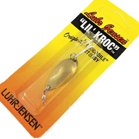 Hergestellt aus massivem Messing für ein kompaktes, massives Profil, wiegt dieser Metallblinker 4,5 g (3/16 oz). Unter Vintage-Liebhabern ist er als Luhr Jensen Lil' Kroc (Krocodile Stubby) bekannt, wobei die Produktion dieses Köders bereits vor etwa 25 Jahren eingestellt wurde. Er trägt den Produktcode 18727 und besticht durch das klassische Gold-Finish, das seit jeher eine feste Größe für Angler auf Forellen und Barsche ist. Die „Stubby“-Variante verfügt über einen breiteren Körper als die herkömmliche Krocodile und wurde für ein markantes Spiel beim Auswerfen oder Schleppangeln entwickelt. Dieses Exemplar ist unbenutzt und perfekt in der originalen gelb-orangen Blisterverpackung aus der Ära von Hood River, Oregon, erhalten. Die Ausstattung umfasst einen hochwertigen Wirbel und einen scharfen Drillingshaken, was der damaligen „Made in USA“-Qualität entspricht. Auf der Rückkarte der Verpackung ist die Farbe als Messing (Brass) angegeben, passend zum warmen Metallton des Körpers.