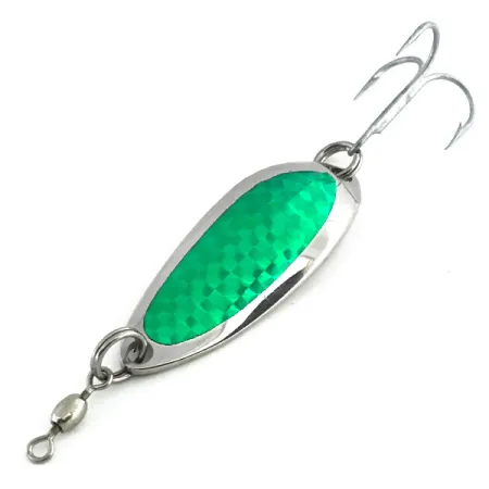 Ein markantes grünes Prismenschuppen-Muster ist in die Vorderseite dieses Luhr Jensen Lil' Kroc eingelassen und fängt das Licht aus jedem Winkel ein. Mit der Prägung „Krocodile Stubby“ auf der Rückseite ist dieser 9 g (1/3 oz) schwere Blinker ein seltener Fund aus dem Luhr Jensen-Katalog, geführt unter dem Produktcode 8735. Mit einer Länge von 4,7 cm (1 3/4") bleibt das vernickelte Finish im unbenutzten Zustand und bewahrt seinen ursprünglichen Werksglanz. Das kompakte, dickbäuchige Design macht ihn zu einem Kraftpaket für seine Größe, ideal um beim Auswerfen oder Schleppen schnell auf Tiefe zu kommen. Die Hardware ist klassische amerikanische Qualität, einschließlich eines hochfesten Drillings und eines integrierten Wirbels, der Schnurdrall im Einsatz minimiert.