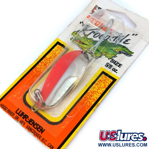 Mit einem Gewicht von 18 g (2/3 oz) zeigt dieser Luhr Jensen Lil' Kroc (Krocodile Stubby) UV das tiefe, löffelartige Profil, das die „Stubby“-Variante von ihren schlankeren Verwandten unterscheidet. Dieser 5,5 cm (2 1/4") lange Köder mit der Artikelnummer 10793 ist in leuchtendem Nickel / Rot gehalten und wurde für eine starke Reizwirkung beim Werfen oder Schleppfischen entwickelt. Ein besonderes technisches Merkmal zeigt sich unter UV-Licht, wo der rote Streifen deutlich aufleuchtet – ein Vorteil für die Sichtbarkeit in tiefen Wasserschichten. Die Hardware besteht aus einem stabilen Drillingshaken und verstärkten Sprengringen, gefertigt nach den langlebigen Standards des Werks in Hood River, Oregon. Dieses Exemplar befindet sich in der Originalverpackung, ist unbenutzt und hat eine Zustandsbewertung von 6. Die Rückseite der Karte enthält das klassische Crocodile-Branding und Herstellungsdetails für die USA und Kanada.