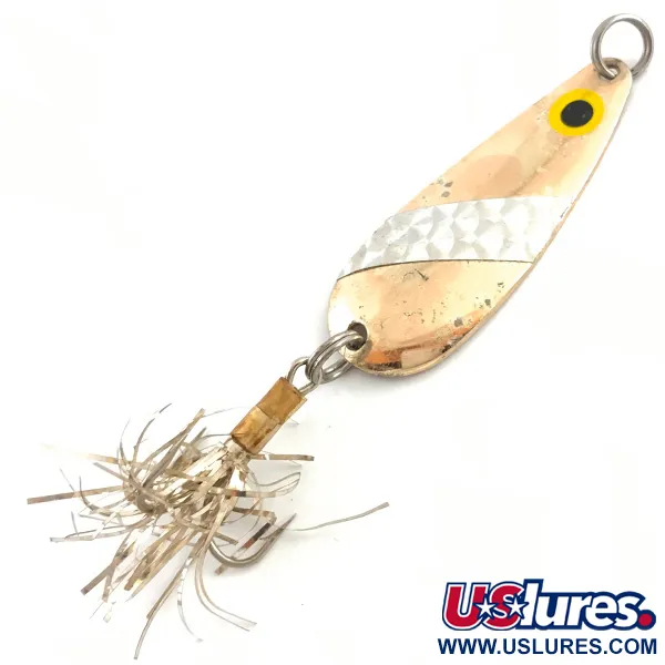 Mit einem Gewicht von 10 g ist dieser Lindy Finsel eine vielseitige Wahl für verschiedene Süßwasserfische. Das Gold-Finish dieses 5,5 cm langen Blinkers verfügt über ein markantes silbernes Band mit Schuppenmuster in der Mitte, das der reflektierenden Oberfläche eine kontrastreiche Textur verleiht. Ein auffälliges gelbes Auge mit schwarzer Pupille befindet sich in der Nähe des oberen Einhängepunkts, während auf der Rückseite der Name Finsel eingeprägt ist, was seine Herkunft von Lindy / Little Joe aus den USA kennzeichnet. Dieses Modell mit der Artikelnummer 4527 ist mit einem silbernen Tinsel-Schwanz am Drilling ausgestattet, der für ein dezentes Schimmern sorgt. Bei einem Zustand von 4/5 weist die Goldbeschichtung leichte Alterserscheinungen mit einem sanften, authentischen Glanz auf. Die Konstruktion wird durch robuste Sprengringe abgerundet, die dem Zug eines kräftigen Fangs standhalten.
