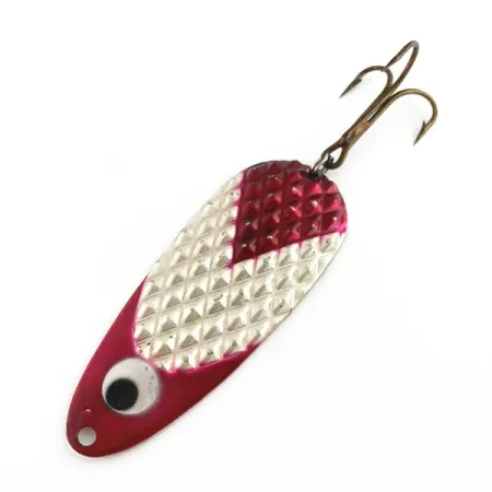 Eine vernickelte Oberfläche mit Rautenstruktur bildet die Basis dieses 55 g (2 oz) schweren Lindy Gator Blinkers. Mit einer Länge von 11,5 cm (4 1/2") besticht der Köder durch eine markante rot-weiße Lackierung über dem eingestanzten Schuppenmuster. Ein tiefrotes V-Muster setzt Akzente im Kopfbereich, während der restliche Körper in eine weiße Mitte mit roten Kanten an der Unterseite übergeht. Hergestellt in den USA von Lindy / Little Joe, trägt dieses Modell die Artikelnummer 23586 und ist für einen verstärkten visuellen Kontrast nahe der Schnuröse mit einem übergroßen Wackelauge ausgestattet. Die Ausstattung besteht aus einem stabilen Drillingshaken, der per Sprengring am Heck befestigt ist. Der Blinker befindet sich in einem Zustand von 4/5 und weist durchweg glänzende Metalloberflächen sowie kräftige Farben auf.