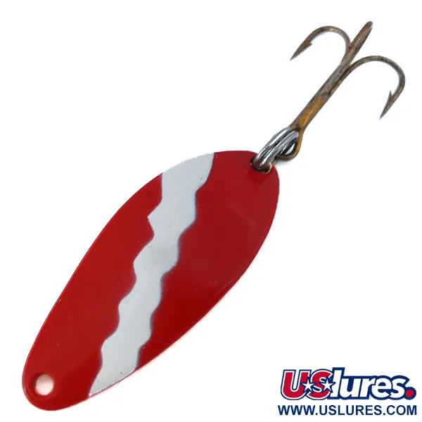 Mit einem Gewicht von 1/4 oz (7 g) repräsentiert dieser klassische Blinker die ursprüngliche Produktionszeit von Seneca Lure vor der Übernahme der Marke durch Acme Anfang der 1980er Jahre. Die Vorderseite ist in einem kontrastreichen rot-weißen Wellenmuster gehalten, einem charakteristischen Design für Sichtbarkeit bei verschiedenen Lichtverhältnissen. Auf der Rückseite ist das messingfarbene Metall tief mit der Kennzeichnung "LITTLE CLEO WIGL LURE SENECA LURE" geprägt, was die amerikanischen Wurzeln unter dem Produktcode 10813 bestätigt. Mit einer Länge von 1 1/2" (4 cm) ist der Körper mit einem gealterten Drillingshaken ausgestattet, der über einen robusten Sprengring befestigt ist. Angesichts der Zustandsbewertung von 4/5 ist der Köder gut erhalten und weist nur geringe Altersspuren auf, während die eingeprägten Buchstaben scharf und die lackierte Oberfläche intakt geblieben sind. Dieses Exemplar fängt die spezifische Materialqualität und Prägetiefe ein, die für die ursprüngliche Produktion der Seneca-Fabrik charakteristisch sind.