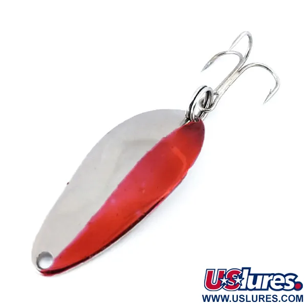Ein markanter roter Diagonalstreifen bildet einen scharfen Kontrast zum polierten Nickelfinish dieses Vintage-Blinkers. Mit einem Gewicht von 7 g (1/4 oz) und einer Länge von 4 cm (1 1/2") weist der Metallkörper eine tiefe rückseitige Stempelung auf, die ihn als echtes Seneca Lure Produkt aus den USA kennzeichnet. Dieses Modell mit der Artikelnummer 10917 stammt aus der Zeit vor der Acme-Ära der frühen 1980er Jahre, was die „WIGL-LURE“-Gravur zu einem bedeutenden Detail für Sammler macht. Der Köder befindet sich in einem 5/5-Zustand mit sauberer, reflektierender Oberfläche und leuchtender Farbe. Er ist weiterhin mit dem originalen Sprengring und Drillingshaken ausgestattet.