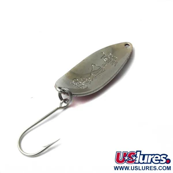 Mit einem Gewicht von 1/2oz (14g) ist das markante Profil dieses klassischen Blinkers jedem Angler sofort ein Begriff, der bereits vor den 1980er Jahren am Wasser war. Dieses besondere Exemplar mit dem Produktcode 0448 wurde von der Seneca Lure Company in den USA hergestellt, bevor die Marke zu Acme überging. Die Vorderseite besticht durch ein lebhaftes Rot-Weiß-Wellenmuster, das beim Auswerfen und Einholen für hohen Kontrast sorgt. Auf der Rückseite findet sich die eingestempelte "Hula Girl"-Tänzerin – ein legendäres Merkmal, von dem viele Fischer der alten Schule überzeugt sind, dass es die späteren Versionen mit glatter Rückseite in der Fängigkeit übertraf. Mit einer Länge von 2 1/4" (5,5 cm) bleibt die massive Metallkonstruktion des Blinkers solide und zuverlässig. Mit einer Zustandsbewertung von 4/5 weist der Köder leichte, ehrliche Altersspuren auf, während Hardware und Lackierung in hervorragendem Zustand sind.