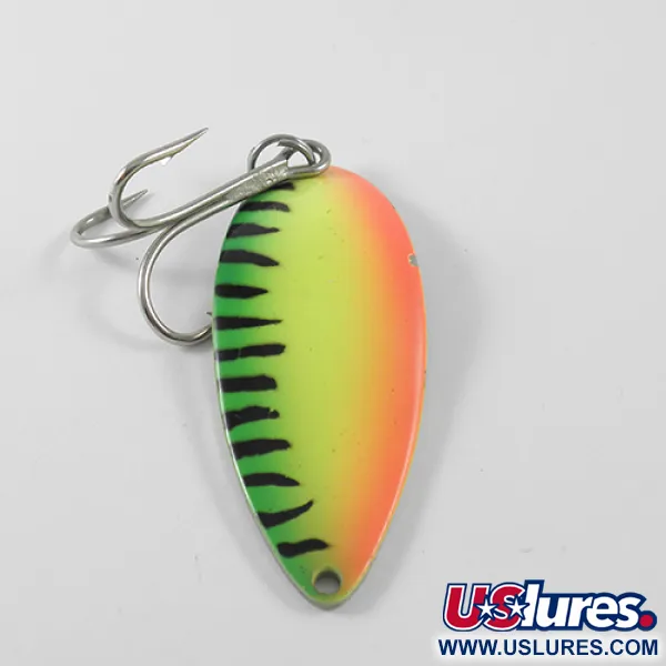 Grün- und Orangetöne, die in ein kräftiges Gelb übergehen, dominieren das Fire Tiger-Dekor dieses 21 g (3/4 oz) schweren Weitwurf-Blinkers. Mit einer Länge von 6,5 cm (2 1/2") ist dieses Exemplar ein Erzeugnis der Seneca Lure Company, hergestellt bevor die Marke Anfang der 1980er Jahre von Acme übernommen wurde. Dreht man den Köder um, findet man die ikonische „Hula Girl“-Tänzerin, die in die vernickelte Rückseite eingeprägt ist – ein Merkmal, das bei modernen Versionen verschwunden ist und für Vintage-Sammler ein wertvolles Detail darstellt. Viele erfahrene Angler behaupten, dass genau dieses Design mit der Tänzerin das Geheimnis hinter dem historischen Erfolg des Köders war. Das vordere Muster wird durch scharfe, schwarze vertikale Streifen akzentuiert, die das fluoreszierende Profil aufbrechen. Dieser unter dem Produktcode 1454 geführte Köder weist ein gut erhaltenes Finish und Hardware auf, was ihm eine Zustandsbewertung von 4/5 einbringt. Er ist mit dem originalen, robusten Drillingshaken ausgestattet, der durch einen stabilen Sprengring gesichert ist, was seine US-amerikanischen Wurzeln unterstreicht.