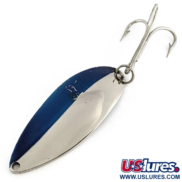 Mit einer geteilten Vorderseite in Tiefblau und poliertem Chrom ist dieser von Seneca gefertigte Blinker ein herausragendes Beispiel für klassisches Angelgerät. Bei einer Länge von 6,5 cm und einem Gewicht von 21 g besitzt er die massive Haptik der frühen Fertigungsserien. Auf der Rückseite ist die ikonische „Hula Girl“-Tänzerin deutlich in das Metall eingeprägt – ein Markenzeichen der Seneca Lure Company aus der Zeit vor der Übernahme durch Acme Anfang der 1980er Jahre. Sammler suchen gezielt nach dieser speziellen Tänzer-Prägung, da sie bei späteren Massenproduktionen bekanntermaßen entfernt wurde. Dieses Exemplar mit dem Produktcode 22171 befindet sich in einem exzellenten Zustand mit einer Bewertung von 5/5. Die rückseitige Prägung weist ihn zudem als Produkt der Seneca Tackle Co. aus und nennt das Gewicht zur einfachen Bestimmung. Die Aufhängung besteht aus einem sauberen Sprengring, der mit dem originalen Drillingshaken verbunden ist.
