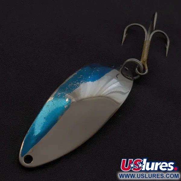 Ein kräftiger blauer Farbakzent auf dem polierten Chrom-Finish unterscheidet diesen 1/2 oz (14 g) schweren Vintage-Blinker von späteren Massenprodukten. Mit einer Länge von 5,5 cm (2 1/4") zeigt dieses Exemplar die ikonische „Hula Girl“-Tänzerin, die auf der Rückseite in das Metall eingeprägt ist – ein Markenzeichen der ursprünglichen Produktion der Seneca Lure Company. Diese spezielle Grafik ist bei Sammlern sehr begehrt, da die Tänzerin kurz nach der Übernahme von Seneca durch Acme in den frühen 1980er Jahren aus dem Design verschwand. Unter der Artikelnummer 23049 geführt, befindet sich der Köder in einem beeindruckenden Zustand 5/5 mit einer hellen, sauberen Oberfläche. Die robuste Hardware umfasst einen stabilen Sprengring und einen scharfen Drillingshaken, ausgelegt für weite Würfe, die dieses Profil über Jahrzehnte hinweg zu einem festen Bestandteil in jeder Angelkiste machten. Die tiefe Verchromung reflektiert das Licht effektiv zusammen mit dem kräftigen blauen Akzent auf der Vorderseite des Köders.