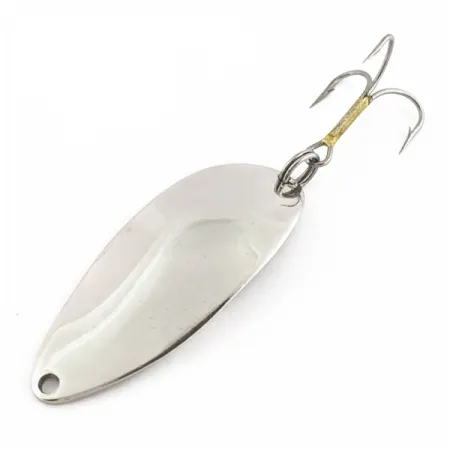 Dieser vernickelte Blinker mit dem markanten eingestanzten Tänzerinnen-Motiv auf der Rückseite repräsentiert das Originaldesign aus der Ära der Seneca Lure Co. Der schwere Metallkörper mit einem Gewicht von 1/2 oz (14 g) ist mit dem charakteristischen breiten Profil für weite Würfe geformt. Das helle Nickel-Finish bedeckt den 5,5 cm (2 1/4") langen Körper, auf dessen Rückseite die Prägungen „LITTLE CLEO“ und „SENECA LURE CO.“ deutlich sichtbar sind. Angler suchen oft gezielt nach diesem Hula Girl-Detail, das nach der Übernahme durch Acme Anfang der 1980er Jahre eingestellt wurde. Dieses Exemplar mit dem Produktcode 24590 weist eine saubere Oberfläche und eine Zustandsbewertung von 5/5 auf. Die Hardware besteht aus einem einzelnen Drillingshaken an der hinteren Öse.