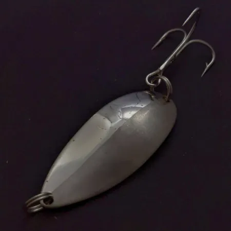 Eine duale Nickel-Oberfläche definiert die konvexe Seite dieses 21 g schweren Blinkers und kombiniert eine hochglanzpolierte Spiegelfläche mit einer dezenten matten Bürstung. Dieser unter erfahrenen Anglern als Hula Girl bekannte Original-Köder der Seneca Lure Co. trägt auf der Rückseite die eingestanzte Silhouette eines tanzenden Mädchens – ein Merkmal, das verloren ging, als die Produktion Anfang der 1980er Jahre den Besitzer wechselte. Mit einer Länge von 6,5 cm ist der massive Metallkörper auf beachtliche Wurfweiten ausgelegt. Die Nickelbeschichtung ist gut erhalten und wird aufgrund der sauberen Oberflächen und der klaren Stanzung mit 4/5 bewertet. Dieser spezielle von Seneca gefertigte Blinker stammt aus der Ära, bevor das Tänzerinnen-Detail aus der Gussform entfernt wurde. Produktcode: 24606.