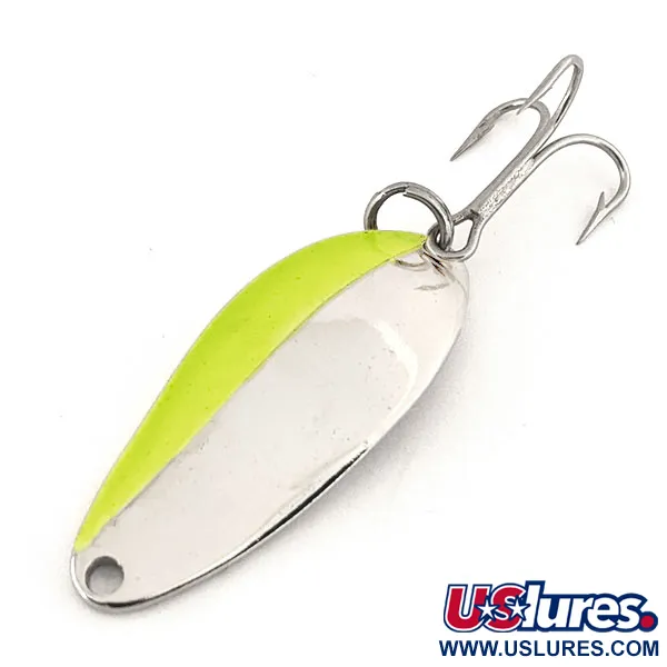 Die in das polierte Metall geprägte Markierung „A SENECA LURE“ bestätigt, dass dieser 7g (1/4oz) schwere Blinker aus der Zeit vor der Übernahme durch Acme Anfang der 1980er Jahre stammt. Ein auffälliger Streifen in leuchtendem Neongrün verläuft entlang einer Kante des 4cm (1 1/2") langen, vernickelten Körpers und bildet einen scharfen Kontrast zur hochglänzenden Oberfläche. Dieses Exemplar wird mit 5/5 bewertet und weist eine außergewöhnlich saubere Oberfläche sowie die Original-Hardware auf. Der Drilling ist nach wie vor scharf und mittels eines robusten Sprengrings befestigt, was charakteristisch für die US-Produktion jener Ära ist. Da Seneca vor dem Besitzerwechsel eine spezifische Metallstärke verwendete, sind diese Köder für ihr Wurfgewicht und ihre Langlebigkeit hochgeschätzt. Das Loch am Kopfende ist sauber gestanzt und ermöglicht das direkte Anbinden der Schnur oder die Verwendung eines Snaps für verschiedene Präsentationen.