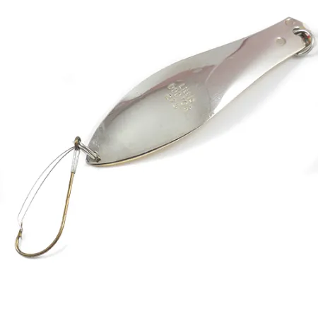 Die zweifarbige Metallbeschichtung ist ein Markenzeichen dieses klassischen Designs und zeichnet sich durch einen deutlichen Kontrast zwischen dem glänzenden Gold- und Nickelfinish aus. Deutlich in das Metall gestanzt, bleibt das Branding „Little Doctor 275“ auf der konkaven Seite des 9 cm langen Löffelblinkers scharf erkennbar. Dieses Exemplar von Prescott Spinner mit dem Produktcode 1960 bringt 21 g auf die Waage und bietet genug Masse für weite Würfe oder um tiefere Wasserschichten zu erreichen. Die Hardware ist besonders interessant und besteht aus einem großen Einzelhaken, der mit einem Krautschutz aus Draht ausgestattet ist, um das Fischen in krautigen Gewässern zu erleichtern. Mit einem Zustand von 5/5 behalten die Oberflächen einen hellen, spiegelnden Glanz. Ein stabiler Sprengring an der Nase sorgt für eine zuverlässige Verbindung zum Vorfach. Hergestellt in den USA, ist das Modell robust gefertigt, und der Einzelhaken bleibt werkseitig scharf und sicher befestigt.