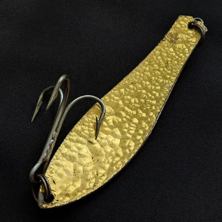 Eine gehämmerte Kristallstruktur auf der goldfarbenen Vorderseite verleiht dieser Kreation von Prescott Spinner ihr charakteristisches Finish. Mit einer Länge von 9 cm (3 1/2") und einem Gewicht von 19 g (2/3 oz) verdeutlicht dieser Little Doctor 275 Crystal (Produktcode 21830) die für klassische amerikanische Blinker typischen Veredelungen. Auf der Rückseite ist eine gut lesbare „DOCTOR“-Prägung oberhalb von drei kleinen roten Punkten nahe der Wirbelöse eingestempelt. Der silberne Drillingshaken ist mittels eines robusten Sprengrings sicher am breiteren Ende montiert. Der Köder befindet sich in einem Zustand von 4/5, mit einer sauberen Oberfläche und einer ausgeprägten Textur auf beiden Seiten des Metallkörpers.