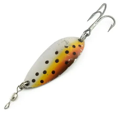 Mit einem Gewicht von 14 g (1/2 oz) verfügt dieser klassische Blinker über ein markantes Trout-Muster auf einer polierten Nickelbasis. Der Metallkörper hat eine Länge von 5,5 cm (2 1/4") und ist auf der Rückseite mit dem Namen „LITTLE JEWEL“, dem Luhr Jensen Branding und der Herkunft USA sowie einer optischen Gewichtsmarkierung von 2/5 oz gestanzt. Leichte Lackabplatzungen und Oberflächenalterung auf der Vorderseite des Blinkers belegen den Zustand 4/5 dieses Sammlerstücks. Das Trout-Dekor geht von Silber in einen warmen orange-gelben Ton über, unterbrochen von dunklen Punkten, um natürliche Salmoniden zu imitieren. Dieses spezifische Exemplar mit dem Produktcode 8733 ist ein Vintage-Modell, das seit vielen Jahren nicht mehr hergestellt wird. Zur Montage ist am Kopf ein Tönnenwirbel angebracht, während am Heck ein scharfer Drillingshaken per Sprengring gesichert ist.