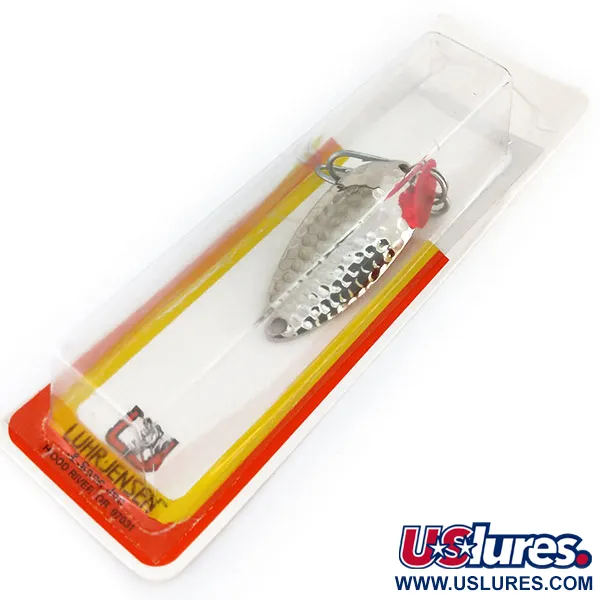 Die geprägte Hammerschlag-Struktur auf dem vernickelten Körper sorgt bei diesem 14g (1/2oz) schweren Wurflöffel für eine hohe Lichtreflexion. Dieser unbenutzte Luhr Jensen Little Jewel befindet sich in der originalen Klarsicht-Blisterverpackung mit der klassischen rot-gelben Grafik aus der Ära von Hood River, Oregon. Am hinteren Sprengring ist neben dem Drillingshaken ein kleines rotes Lockplättchen montiert, das für einen optischen Kontrastpunkt sorgt. Mit einer Länge von 5,5 cm (2 1/4") ist der Köder durch den Produktcode 9673 und die SKU 1233-999-0101 auf der Rückseite der Karte gekennzeichnet. Die Rückseite der Verpackung zeigt zudem ein Produktionsdatum von 2005 und zweisprachige Kataloganleitungen, was das nordamerikanische Erbe dieses Vintage-Köders unterstreicht.