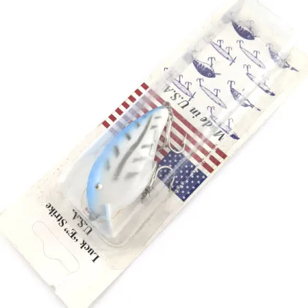 Blau akzentuierte Schuppen zieren den weißen Körper dieses 5 cm langen, schwimmenden Crankbaits, ein Vintage-Modell mit einem Gewicht von 7 g. Unter dem Produktcode 21356 geführt, ist dieser Köder unbenutzt in seiner originalen Verpackung im US-Design erhalten, die mit einem markanten Flaggendesign auf seine amerikanische Herkunft hinweist. Die Bauweise ist speziell für den Einsatz im Flachwasser ausgelegt und erreicht eine Lauftiefe von 0,3 bis 0,9 m. Er eignet sich zum Werfen oder Schleppen und wurde ursprünglich für die gezielte Fischerei auf Rapfen, Barsch und Hecht empfohlen. Die Rückseite der Verpackung gibt einen Einblick in die Firmengeschichte und nennt den Luck „E“ Strike USA Firmensitz in Cassville, MO, sowie den Vertrieb durch Ken International Inc. Das Dekor dieses Exemplars ist sauber erhalten, mit den charakteristischen rippenartigen Markierungen an den Flanken und einer strahlend weißen Bauchseite.