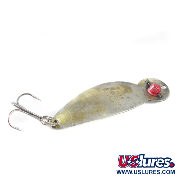Dieser Vintage-Metallblinker mit der Prägung „LUCKY STRIKE CANADA“ auf der Rückseite zeigt die klassische Handwerkskunst eines legendären nordamerikanischen Herstellers. Eine facettierte rote Glasperle ist fest im Kopfbereich des Köders verdrahtet und bildet einen kontrastreichen optischen Fixpunkt. Mit einer Länge von 7 cm und einem Gewicht von 12 g verfügt der Körper über ein versilbertes / vergoldetes Finish, bei dem das zweifarbige Metall über das geschwungene Profil sichtbar ist. Die Tropfenform geht in einen kreisförmigen oberen Abschnitt über, der die Schnuröse und den charakteristischen roten Edelstein beherbergt. Unter dem Produktcode 1527 geführt, weist dieses Exemplar eine Zustandsbewertung von 4/5 auf und zeigt ehrliche Altersspuren bei voller Funktionsfähigkeit. Zur Ausstattung gehört ein stabiler Drillingshaken an einem Sprengring am Ende, bereit für das Spinn- oder Schleppfischen.