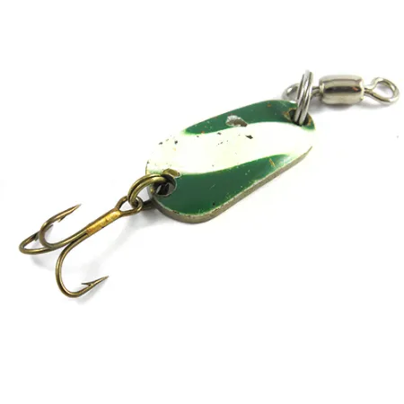 Ein auffälliges weiß-grün lackiertes Muster ziert die Vorderseite dieses 2,5 cm (1") langen Blinkers, eingefasst von der natürlichen Wärme seiner Messingbasis. Dieses in den USA hergestellte Luhr Jensen Exemplar mit dem Produktcode 2421 verfügt über ein kompaktes Profil mit einem Gewicht von 1/4oz (7g). Auf der Rückseite ist der Luhr Jensen Herstellerstempel deutlich auf der Messingoberfläche zu erkennen, ein Markenzeichen für die Tradition der Marke in den USA. Die Ausstattung umfasst einen robusten Tönnchenwirbel an der Öse und einen brünierten Drilling. Der Erhaltungszustand wird mit 4/5 bewertet, mit ehrlichen Gebrauchsspuren durch leichten Lackverlust auf der emaillierten Vorderseite und dezenten Abnutzungen an den Metallkanten. Diese kleinen Zeitspuren sind typisch für Vintage-Metallköder dieser Ära und beeinträchtigen die Integrität der Konstruktion des Wurflöffels nicht.