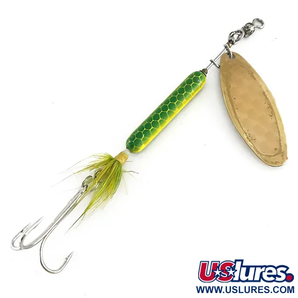Die goldene Oberfläche des weidenblattförmigen Spinnerblatts prägt diesen Vintage-Fund, der eine deutliche „BANG TAIL 6“-Prägung auf seiner messingfarbenen Oberfläche trägt. Der unter der Artikelnummer 8411 geführte Luhr Jensen Bang Tail zeichnet sich durch ein markantes Waben-Schuppenmuster auf seinem zylindrischen Körper aus, das Waldgrün mit einem leuchtend gelben Bauch kombiniert. Mit einem Gewicht von 17 g (3/5 oz) ist der Köder auf einem robusten Drahtrahmen aufgebaut, der typisch für US-amerikanisches Angelgerät aus dieser Zeit ist. Am Schwanzende ist er mit einem Drillingshaken ausgestattet, der mit gelben und grünen Fasern gebunden ist und so für einen zusätzlichen visuellen Reiz sorgt. Dieses Exemplar weist einen hohen Pflegezustand auf, was eine Zustandsbewertung von 4/5 rechtfertigt. Eine Hammerschlag-Struktur auf der Innenseite des Blattes sorgt für subtile Lichtreflexe, wenn sich das Blatt bei gleichmäßigem Einholen dreht.