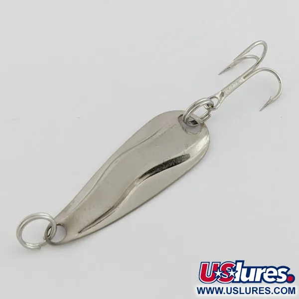 Auf der Rückseite deutlich mit HOT SHOT W geprägt, weist der Körper des Köders ein markantes dreifach konturiertes Wellenprofil auf, das ihn von herkömmlichen flachen Blinkern abhebt. Dieses Exemplar von Luhr Jensen ist in hochglanzpoliertem Nickel ausgeführt, misst 3 cm (1 1/4") in der Länge und wiegt filigrane 1,3 g (3/64 oz). Die Ausstattung umfasst einen werkseitig montierten Treble-Hook sowie Sprengringe an Kopf und Schwanz für vielseitige Montagemöglichkeiten. Dieser für technisches Wurfangeln oder leichtes Schleppen im Süßwasser konzipierte Köder ist ein spezialisiertes Werkzeug für Forellen- und Steelhead-Angler mit feinem Gerät. Die Metalloberfläche ist in hervorragendem Zustand (Bewertung 5/5) und zeigt einen hellen, reflektierenden Glanz über die gesamte Form. Die technischen Daten für dieses Stück sind unter dem Produktcode 24441 registriert.